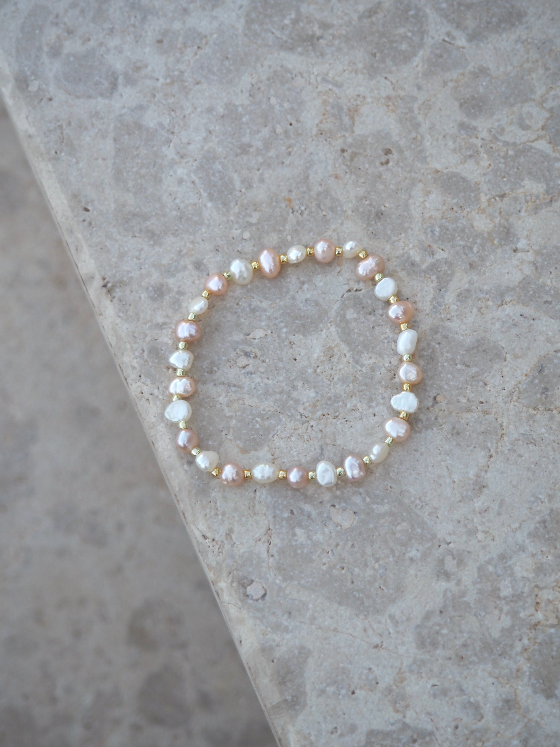 Die Materialien des Armbands sind wasser- und hautverträglich. Um dein Schmuckstück jedoch lange genießen zu können, vermeide den Kontakt mit Chlor- und Salzwasser, da diese die Perlen beschädigen und sie somit ihren Glanz verlieren.