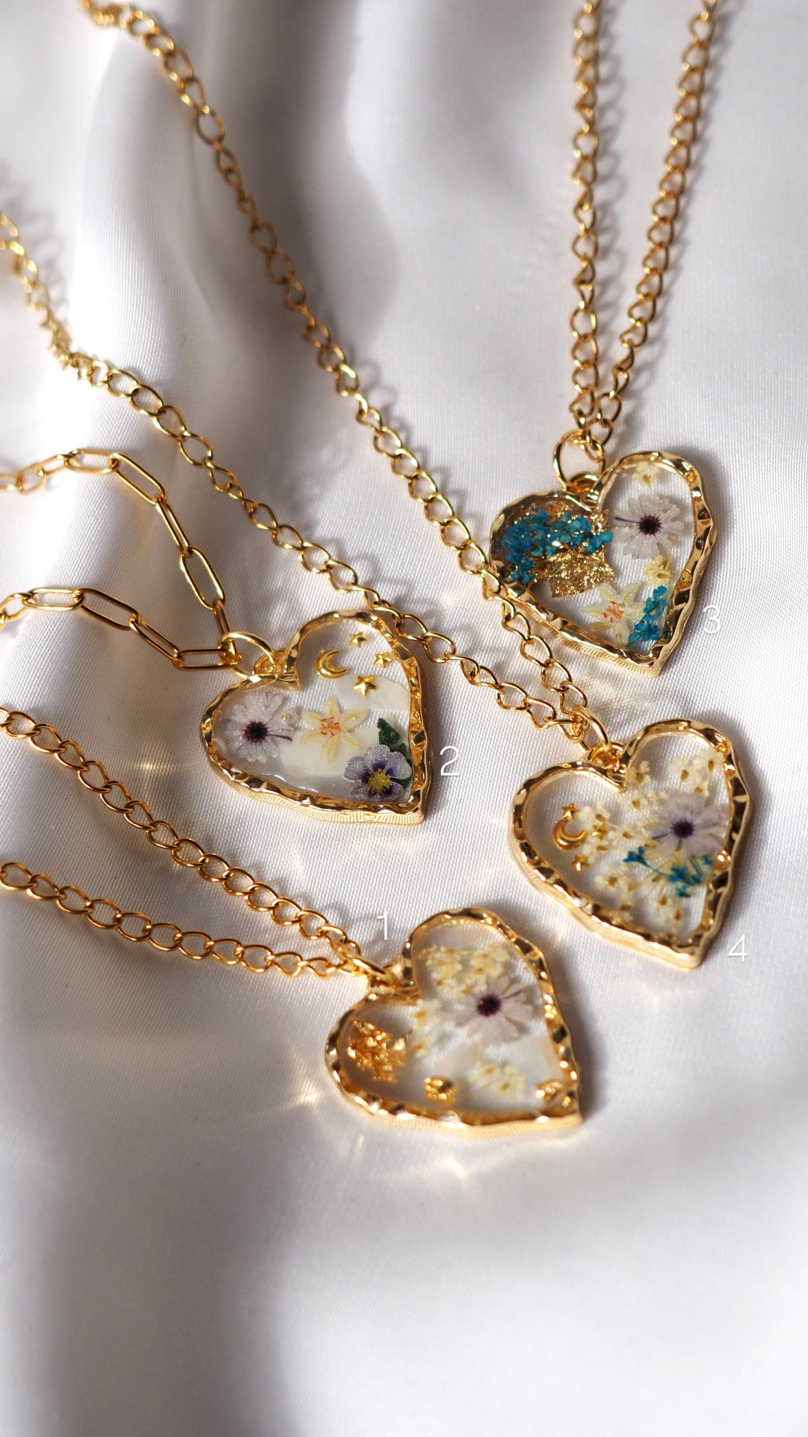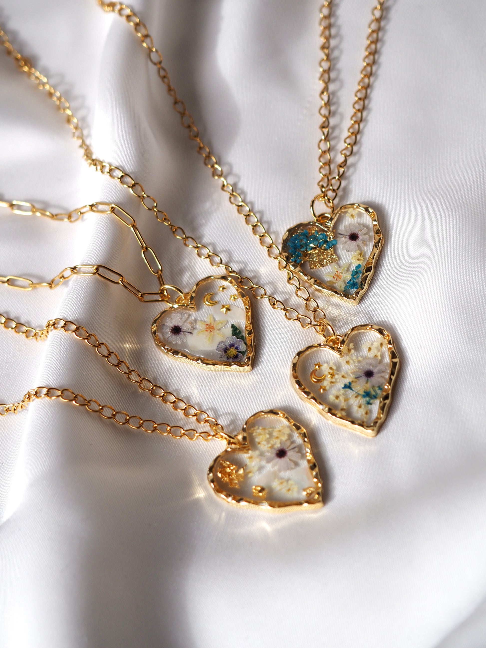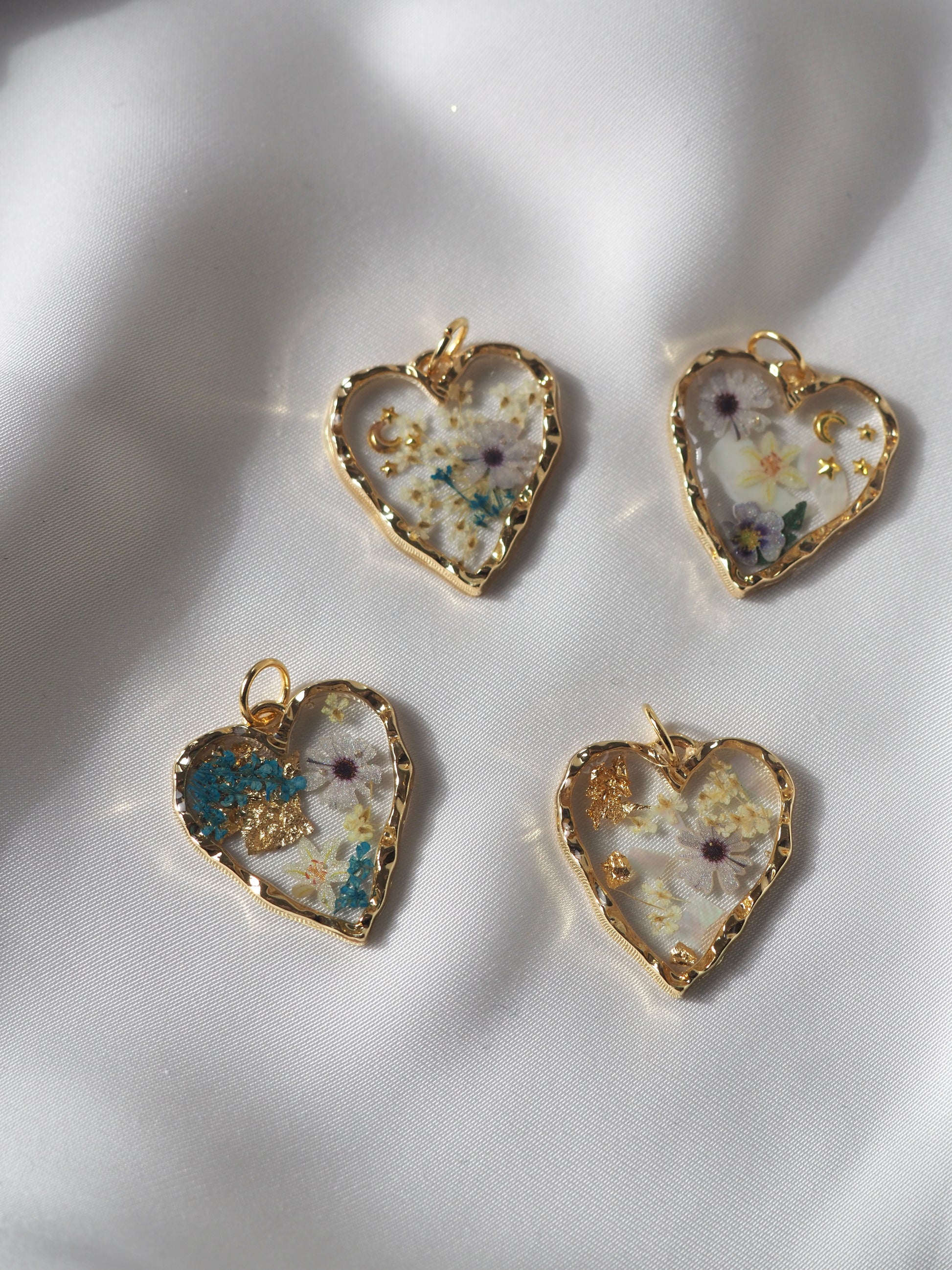 Der Anhänger ist handgemacht aus Trockenblumen und Epoxidharz.