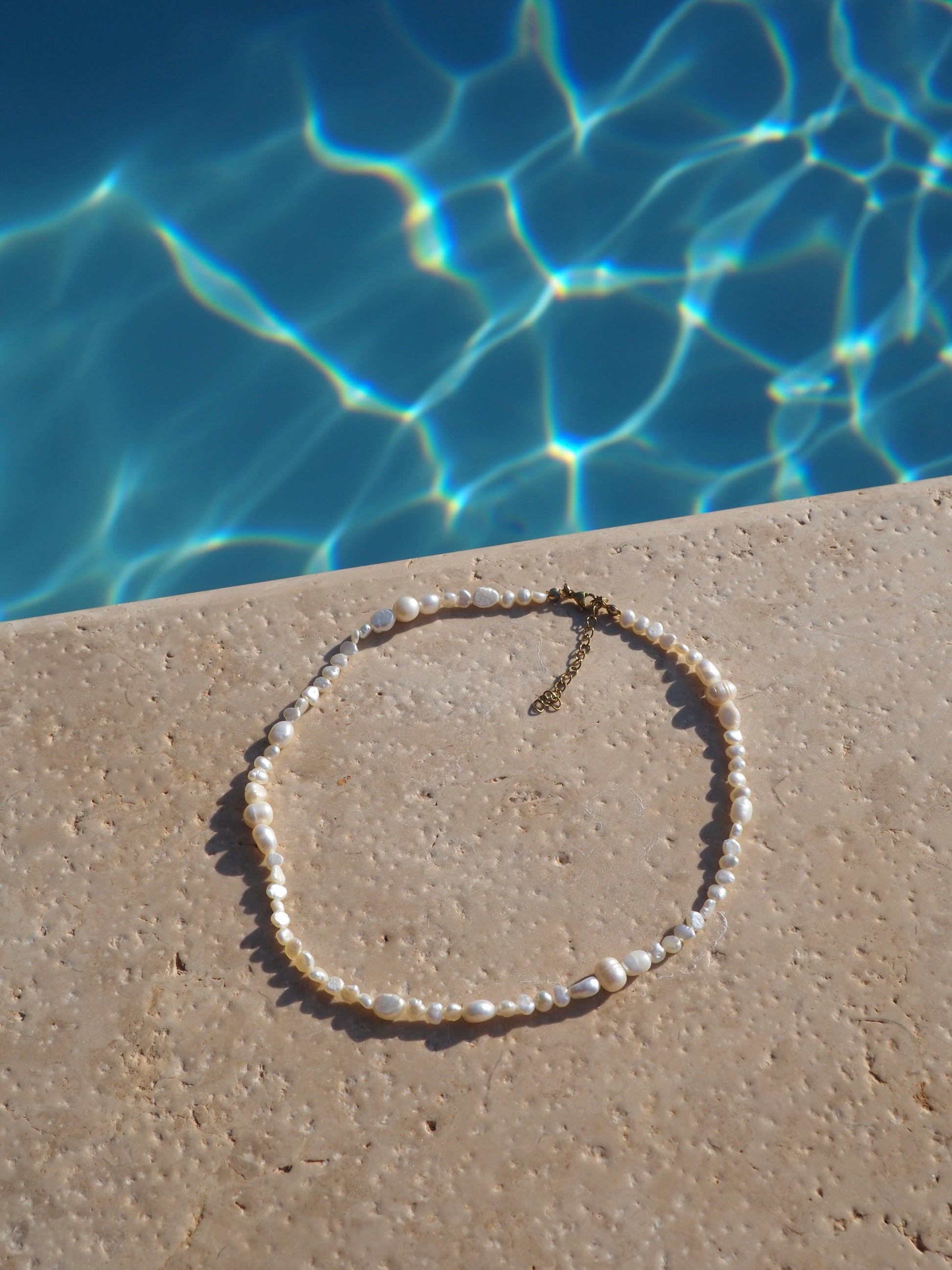 Die Materialien der Kette sind wasser- und hautverträglich. Um dein Schmuckstück jedoch lange genießen zu können, vermeide den Kontakt mit Chlor- und Salzwasser, da diese die Perlen beschädigen und sie somit ihren Glanz verlieren.