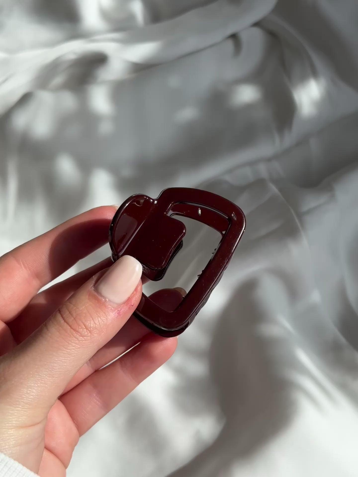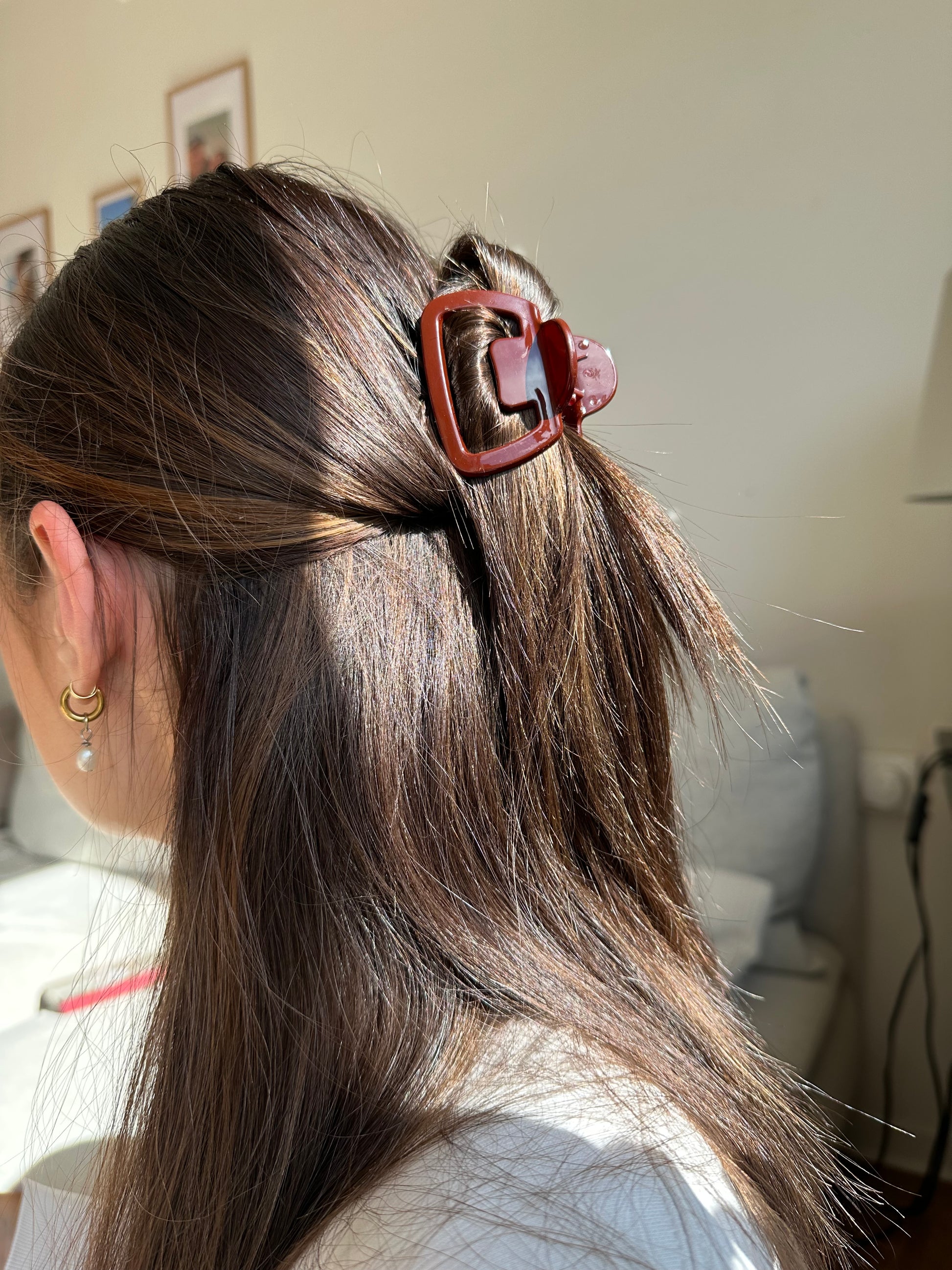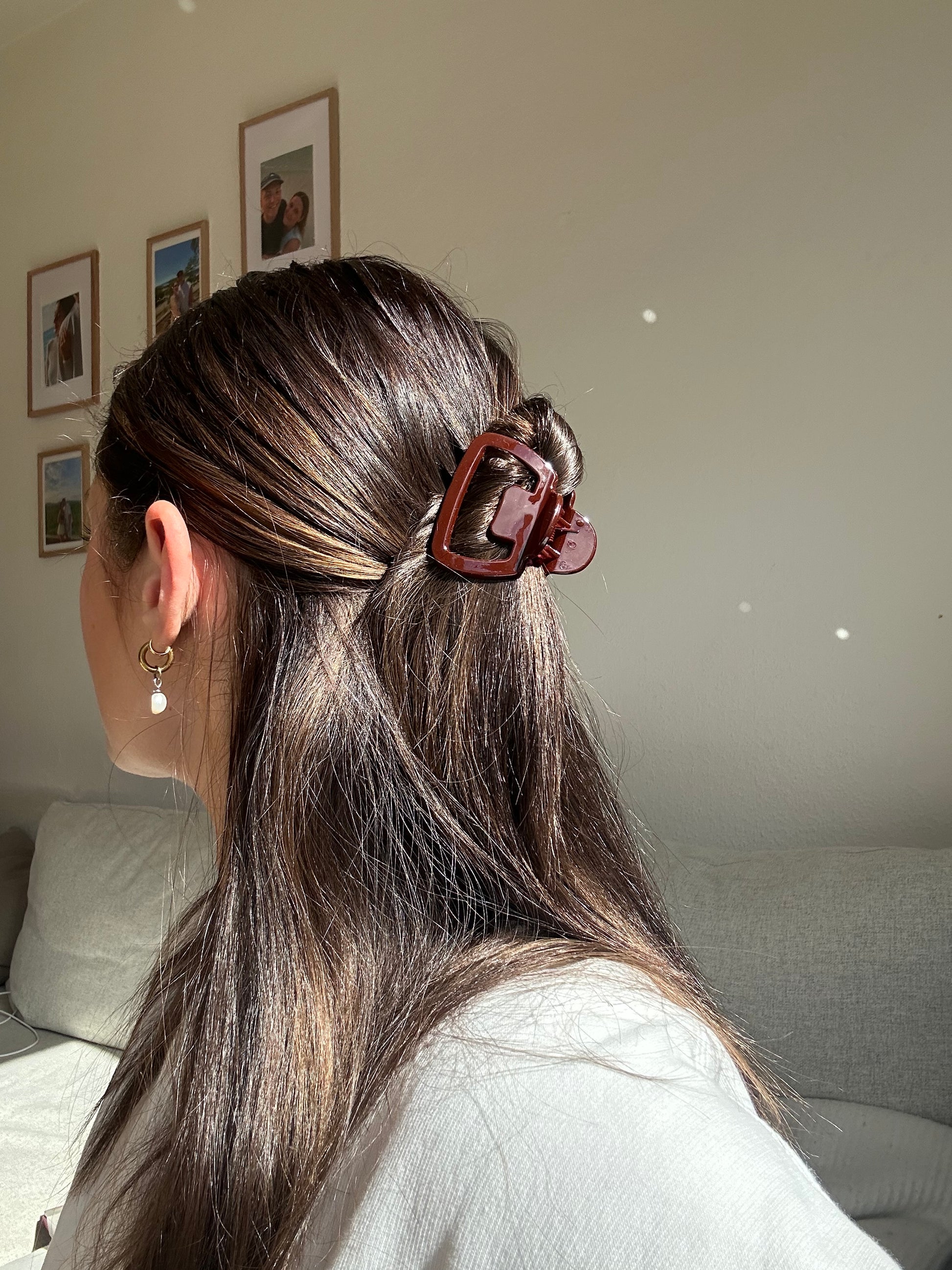 cute und stylisch! Die Haarspange hält sowohl dickes als auch dünnes Haar. Sie besteht aus recyceltem hart Plastik und ist mit ihrem dunkel roten Ton die perfekte Ergänzung zu jedem Outfit und für einen süßen Half up Hairstyle!