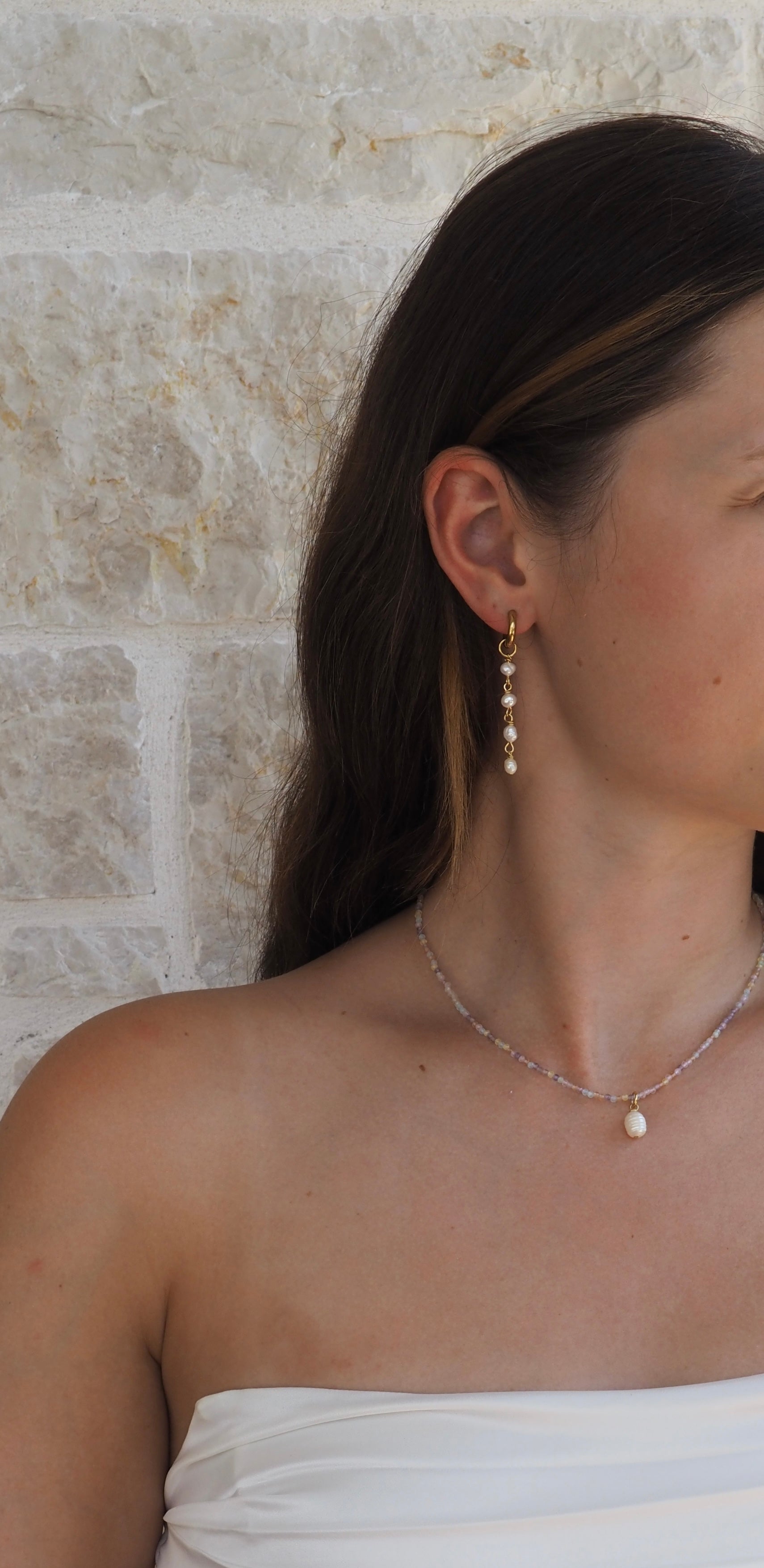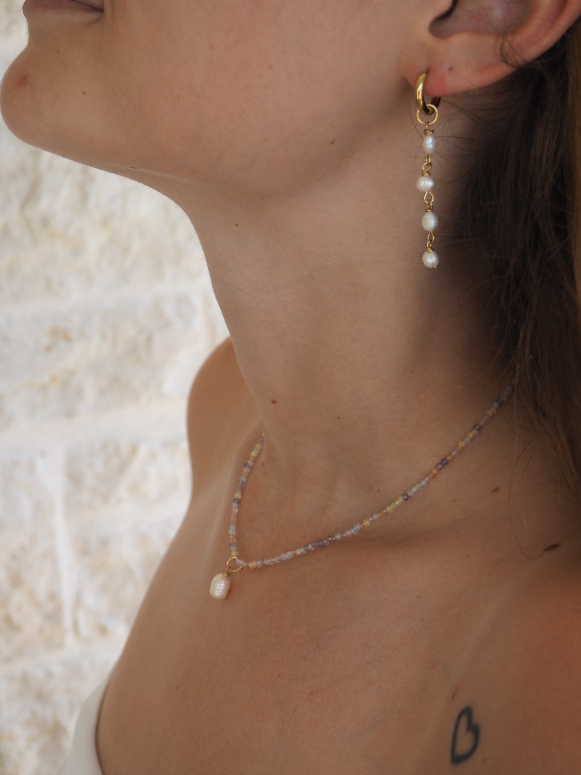 Die Materialien der Kette sind wasser- und hautverträglich. Um dein Schmuckstück jedoch lange genießen zu können, vermeide den Kontakt mit Chlor- und Salzwasser, da diese die Perlen beschädigen und sie somit ihren Glanz verlieren.